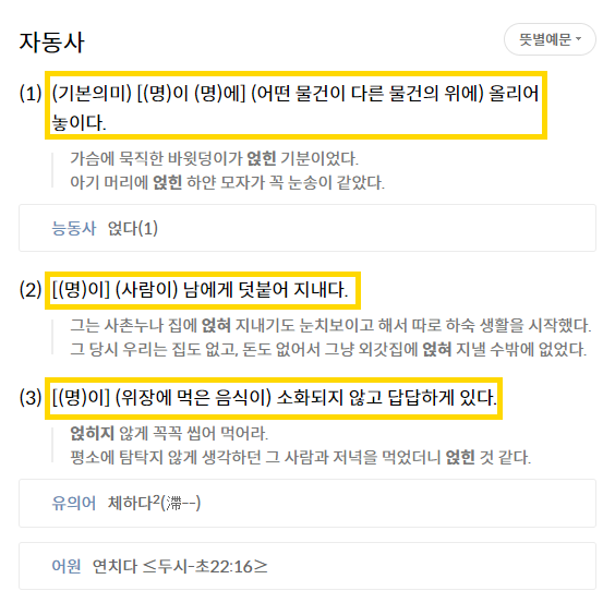 얹히다, 얹치다, 언치다 검색 시 모두 다 "얹히다"로 자동 수정되어 검색이 되네요.